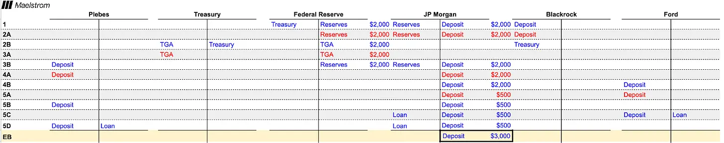 就像之前的例子一样,财政部发出的支票会被普通人存入摩根大通的账户。