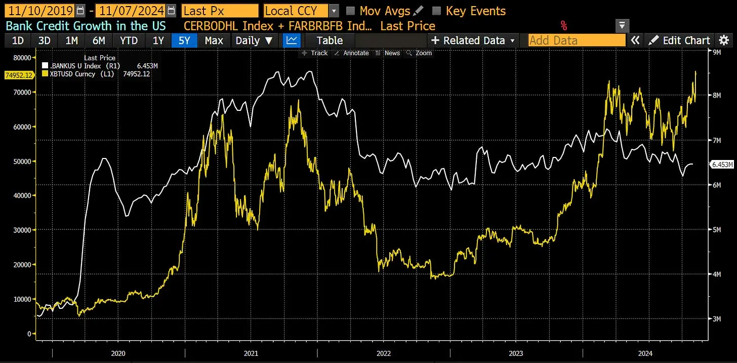 我创建了一个自定义的 Bloomie 指数,它结合了储备金和其他存款及负债 。这是我用来追踪美国银行信贷数量的自定义指数。在我看来,这是最重要的货币供应指标。正如你所见,有时它会领先于比特币,比如在 2020 年,而有时它会落后于比特币,比如在 2024 年。