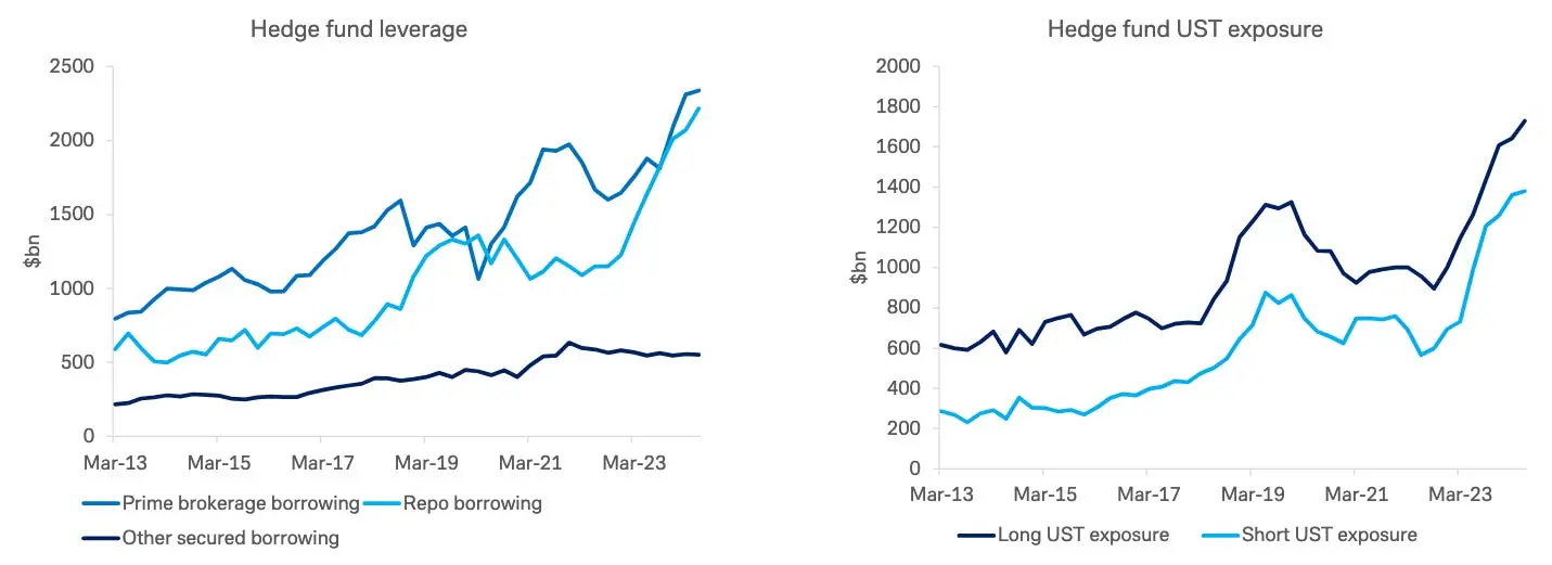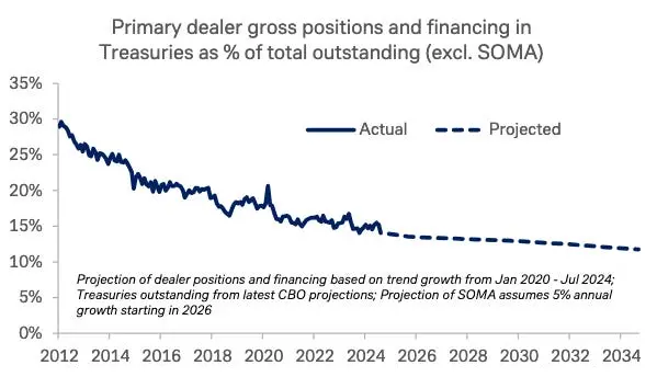 这是财政借款咨询委员会 (TBAC) 于 2024 年 10 月 29 日发布的一份关于财政市场金融弹性的演示中的一张图表。图表显示,银行系统持有的国债占总未偿债务的比例正在减少,接近最低舒适储备水平 (LCLoR)。这带来了问题,因为随着美联储进行量化紧缩 (QT) 和盈余国家的中央银行出售或不再投资其净出口收益(即去美元化),国债市场的边际买家变成了不稳定的债券交易对冲基金。
