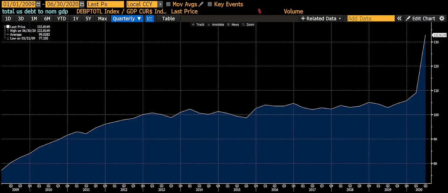 所有这些交易结束后,并没有创造出任何实际的经济活动。美联储通过向经济注入2万亿美元的资金,实际上只是增加了富人的银行账户余额。即使是对一家美国公司的融资也没有产生经济增长,因为这些资金被用于推高股价,而没有创造新的就业机会。1美元的量化宽松导致货币供应增加1美元,但没有带来任何经济活动。这并不是合理利用债务的方式。因此,从2008年到2020年,量化宽松期间的债务与名义 GDP 的比率在富人中上升。