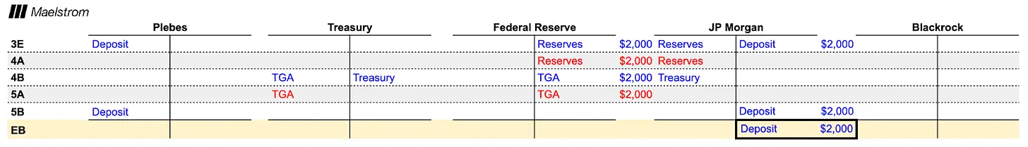 与第一个例子不同,这次财政部也参与了资金流动。为了支付特朗普政府的经济刺激支票,政府需要通过发行国债来筹集资金。Blackrock 选择购买国债而非公司债券。JP Morgan 协助 Blackrock 将其银行存款转换为美联储的储备金,这些储备金可以用于购买国债。财政部在美联储的财政部一般账户(TGA)中获得了类似于支票账户的存款。