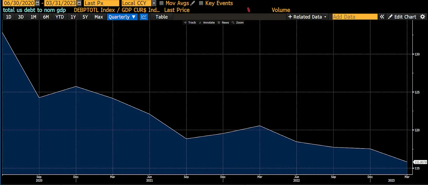 从2020年第二季度到2023年第一季度,特朗普和拜登总统采取了不同的做法。他们的财政部发行了由美联储通过量化宽松(QE)购买的债务,但这次不是发给富人,而是直接寄支票给每个公民。穷人们的银行账户里确实收到了现金。显然,摩根大通的 CEO Jamie Dimon 从政府转账的手续费中获利不少……他被称为美国的李嘉诚,你无法避免向他支付费用。穷人之所以贫穷,是因为他们把所有的钱都用在购买商品和服务上,而在这段时期,他们确实这样做了。随着货币流通速度显著加快,经济增长迅速。也就是说,1美元的债务带来了超过1美元的经济活动。因此,美国的债务与名义 GDP 比率神奇地下降了。