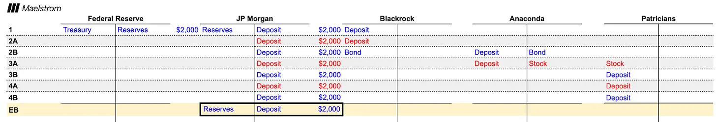 美联储从 Blackrock 购买了价值2000亿美元的国债,并通过储备金进行支付。JP Morgan作为银行在这次交易中发挥了中介作用。JP Morgan 获得了2000亿美元的储备金,并为Blackrock 记入了2000亿美元的存款。美联储的量化宽松政策使银行创造了存款,这最终成为货币。