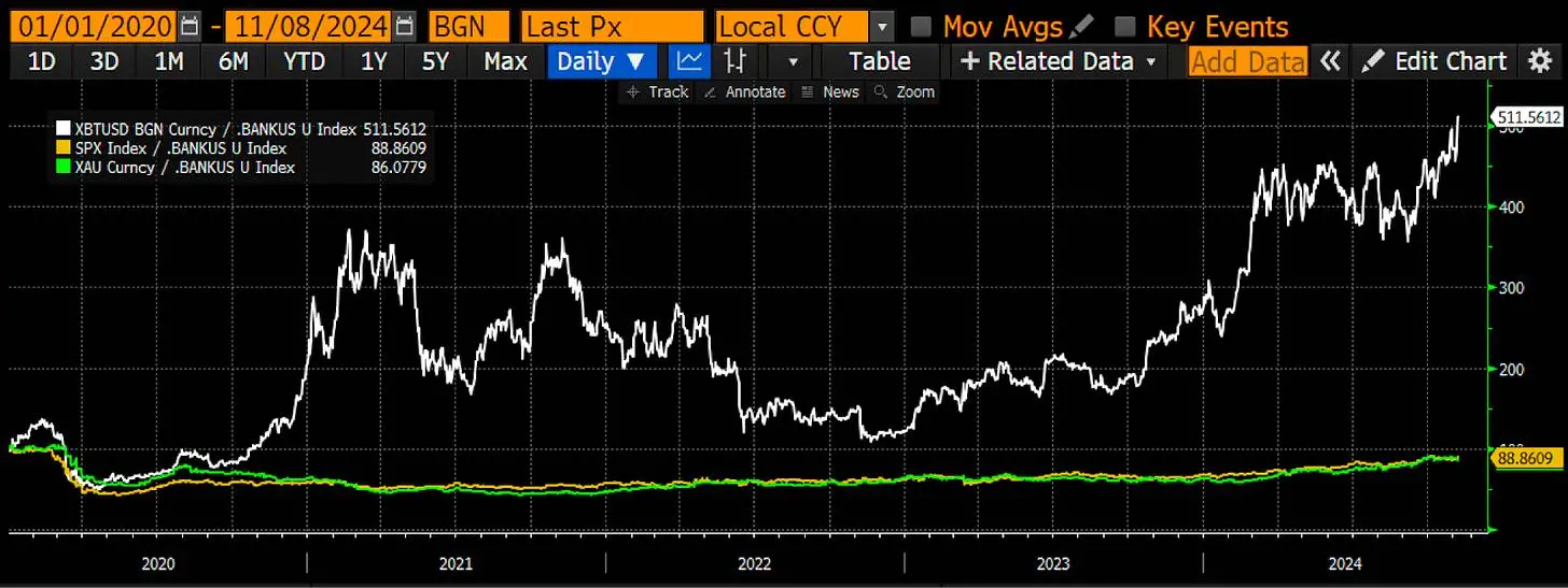 然而,更为关键的是,资产在银行信贷供应量缩减时的表现。比特币(白色)、标准普尔 500 指数(黄金)和黄金(绿色)都经过我的银行信贷指数调整。数值被标准化为 100,可以看到,比特币的表现最为突出,自 2020 年以来上涨了超过 400%。如果你只能采取一种措施来抵御法币贬值,那就是投资比特币。数学数据不容争辩。