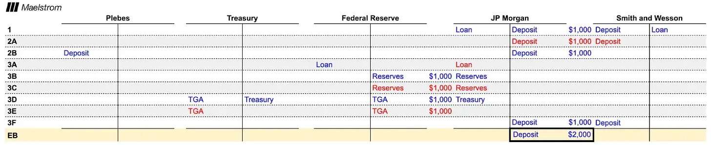 财政部需要通过拍卖发行1000美元的新债务来资助对史密斯和韦森的补贴。摩根大通参加拍卖会购买债务,但没有足够的储备来支付债务。由于现在使用美联储的贴现窗口已不再有任何负面影响,摩根大通便将其史密斯和韦森的公司债务资产作为抵押品,获取美联储的储备贷款。这些储备用于购买新发行的财政部债务。然后财政部将补贴支付给史密斯和韦森,这笔资金又成为摩根大通的存款。