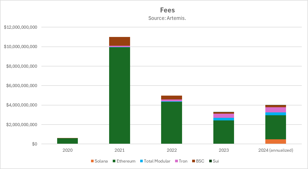 评估以太坊模块化策略对其成功的影响的另一种方法是观察其市值的变化。2023 年,ETH 的市值增长了 1280 亿美元。相比之下,Solana 的市值增长了 540 亿美元。尽管 ETH 的绝对增长更高,但 Solana 从一个较低的基数出发,因此其价格增长了 919%,而 ETH 增长了 91%。