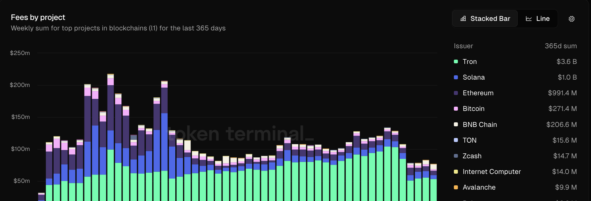 以太坊相比之下,在过去一年中仅产生了$1 亿美元的收入,尽管ETH在八月份达到了历史最高点,市值约为$539 亿美元——超过TRX的(TRX)市值的16倍,后者仅略高于$32 亿美元。 !Fees 过去一年加密网络费用的比较.