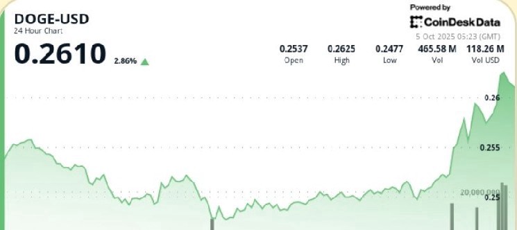 多哥币在周日早盘急剧反弹,从周六的下滑中恢复,重新夺回0.26美元的支撑位。在中场的冲击后,价格在大量交易下升至$0.248,清除了脆弱的多头,随后买家介入,推动价格上涨。DOGE 目前正在 $0.26 以上整固,交易者将 $0.30--$0.33 区域视为下一个阻力区域。新闻背景 • DOGE 在九月份一直在 $0.24--$0.27 的宽幅区间内交易,因为 ETF 申请和机构矿业投资建立了更长期的叙述。• 报告显示,在过去72小时内,大户累计持有20亿DOGE,这与历史上的突破前模式一致。• 在上周170亿美元的清算后,整个加密市场正在稳定,DOGE吸引了资金流入,因为交易者重新回到了高波动性代币中。价格动作总结• DOGE 在周六的盘中抛售中,从 $0.254 下跌至 $0.248,建立了强劲的支撑位在 $0.247--$0.249。• 在投降期间,交易量激增至485.6M,确认了机构参与。• 该代币反弹进入一个上升通道形态,收盘接近$0.252。• 到周日早些时候,DOGE 已经重新回升至 0.26 美元,目前在该水平上方已明显出现整合。• 交易者将$0.30视为下一个阻力测试,$0.33--$0.40作为突破目标。技术分析• 支撑:在经历高成交量反弹后,约$0.247--$0.249的强支撑位。• 阻力:短期在$0.265,广泛的上行目标为$0.30--$0.33。• 交易量:在15:00时激增 (485.6M) 和在晚间交易的反弹中 (>17M 的分钟) 确认了机构流动。• 趋势:从 $0.248 低点形成上升通道结构。• 动量:最后60分钟从$0.251上涨至$0.252 (+0.5%)信号在会话结束时持续有买盘。交易者正在关注什么• DOGE 是否能够维持在 $0.26 之上收盘,以确认基础构建。• SEC待决的DOGE ETF裁决---这可能是机构采用的潜在短期催化剂。• 在72小时内积累2B DOGE后的鲸鱼流动。• 如果动量加速,向$0.30--$0.40突破的潜力。