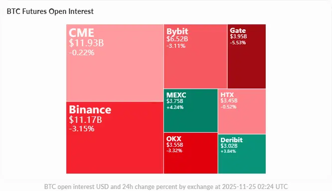 总持仓量597亿美元,24小时下降1.12%,表明杠杆正在降低。融资费率转为负值(Binance -0.0034%,Bybit -0.0047%),空头付费给多头,为价格稳定或上涨提供支撑。