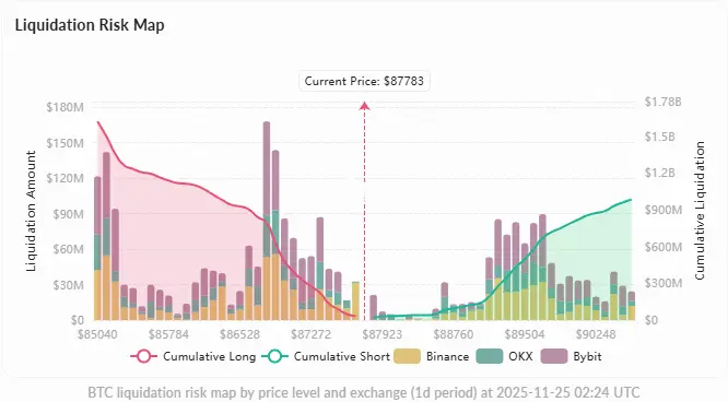 清算风险图显示不对称分布:下方$85,040附近集中16亿美元多头清算,而上方$90,620仅有9.83亿美元空头清算,暗示向下突破风险更大,但如果守住关键支撑,上涨阻力相对较小。