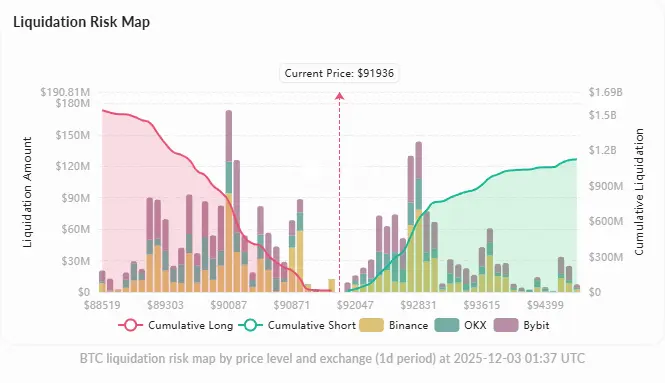 24小时清算数据极端分化:总清算$1.749亿,其中空头清算$1.604亿占比91.7%,多头仅$0.145亿,印证当前反弹由空头挤压驱动。清算密集带显示$88,519下方累积$15.4亿多单清算压力,构成支撑;而$94,791上方累积$11.2亿空单清算,形成阻力磁吸效应。