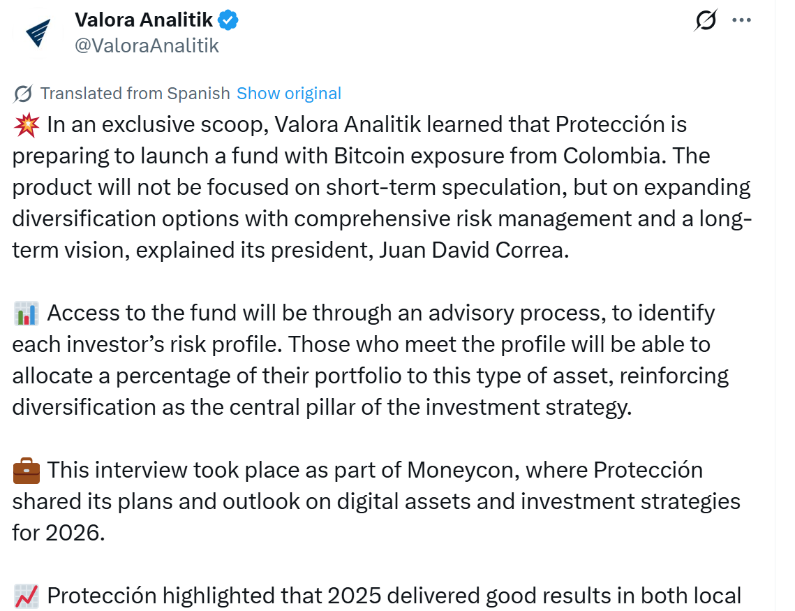 来源:CryptoNewsNet原标题:哥伦比亚第二大养老金基金将提供比特币敞口原始链接: 哥伦比亚第二大私营养老金和遣散基金管理公司AFP Protección正准备推出一只与比特币相关的投资基金。Protection SA的总裁胡安·大卫·科雷亚在接受当地媒体Valora Analitik采访时确认了这一举措。根据科雷亚的说法,产品的访问将受到限制,仅通过个性化咨询流程授予,以评估每位投资者的风险偏好。只有符合特定条件的客户才能将其投资组合的一部分配置到比特币(BTC)。“最重要的元素是多元化,”科雷亚指出,并补充说,“那些能够参与的人如果愿意,可以在其投资组合中找到一个空间,将一定比例暴露于这种类型的资产。”Protección的举措紧随Skandia Administradora de Fondos de Pensiones y Cesantías的类似步骤,后者在去年九月开始在其投资组合中提供比特币敞口。随着此次推出,Protección成为哥伦比亚第二个进入数字资产领域的主要养老金基金管理机构。## 比特币基金不会改变核心养老金投资Protección表示,新的比特币相关基金并不代表哥伦比亚养老金储蓄管理方式的转变。固定收益工具、股票和其他传统资产仍然是养老金投资组合的核心。相反,该产品被定位为合格投资者寻求多元化的额外选择。成立于1991年,AFP Protección管理着超过220万亿哥伦比亚比索(大约$55 十亿)的资产,为超过850万客户提供强制性和自愿性养老金计划以及遣散账户。截至2025年11月,哥伦比亚更广泛的强制养老金基金市场规模已达527.3万亿比索,其中近一半的资产投资于海外。## 哥伦比亚引入强制加密货币报告规则本月早些时候,哥伦比亚税务局DIAN引入了强制报告框架,要求加密货币服务提供商,包括交易所、托管人和中介机构,收集并提交用户和交易数据。该决议使哥伦比亚与OECD的加密资产报告框架(CARF)保持一致,实现了与外国当局的加密相关税务信息的自动交换。在新制度下,服务提供商必须报告可报告用户的身份信息和交易数据,遵守尽职调查和估值标准,否则将面临处罚。
