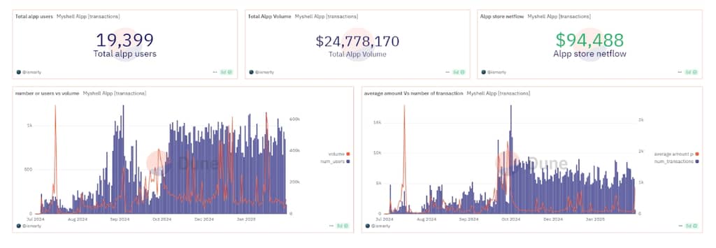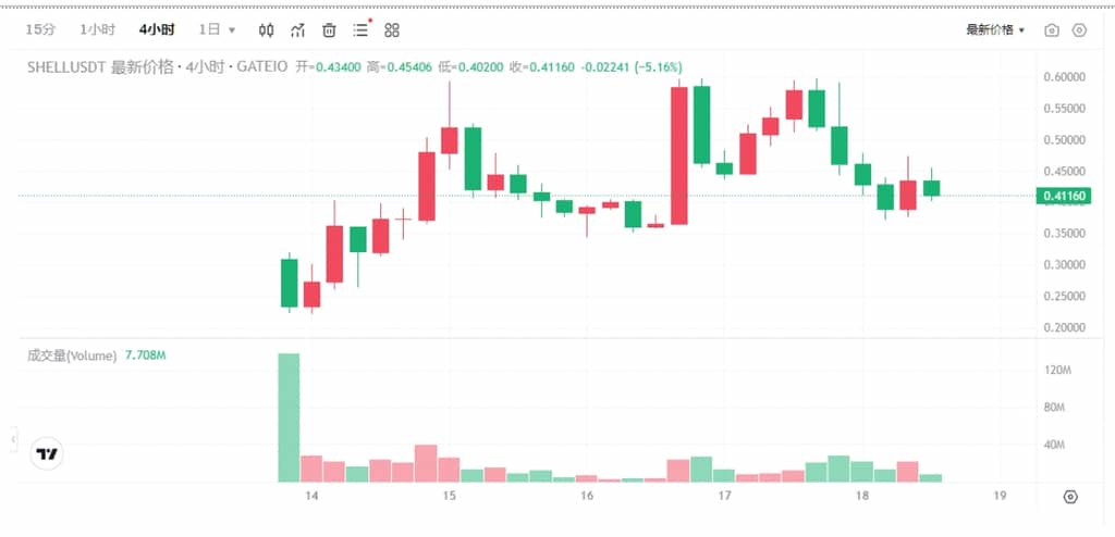 更令人瞩目的是,SHELL 在 TGE(Token Generation Event,代币生成事件)后并未陷入“开盘即巅峰”的魔咒,反而持续上涨,首周涨幅超 300%,市值一度突破 6 亿美元。